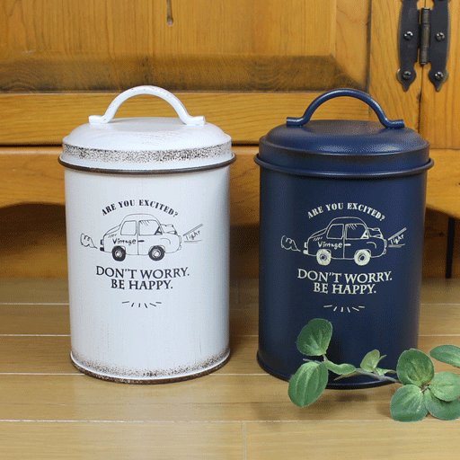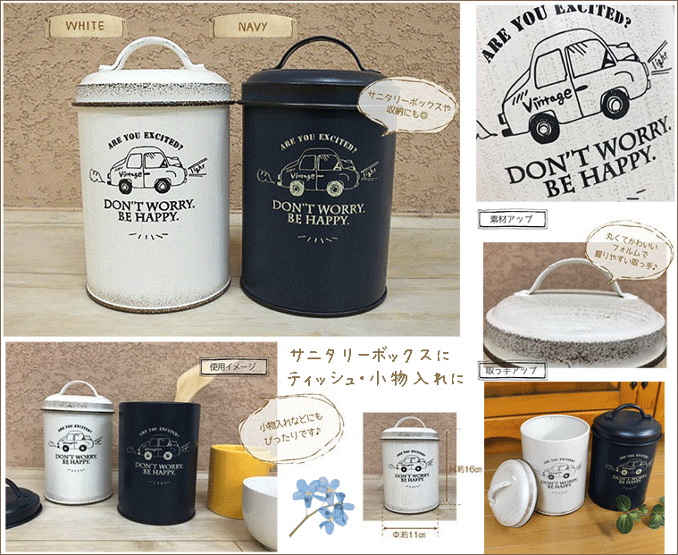 ビンテージ バケツ風 円柱トイレサニタリーポット ”Vintage Car”<アイボリー・ネイビー>11×h16【ふた付き/丸型/おしゃれ/ごみ箱/ダストBOX】