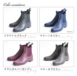 選択肢1:メラナイトブラック(ブラック 黒) マリーノネイビー(ネイビー 紺 青) クラシカルバーガンディ(バーガンディ ワインレッド パープル 赤 紫) マローネブラウン(ブラウン 茶) 選択肢2:35(22cm) 36(23cm) 37(24cm) 38(24.5cm) 39(25cm) 40(25.5cm) 今やレインブーツの定番として多く見られるサイドゴア。